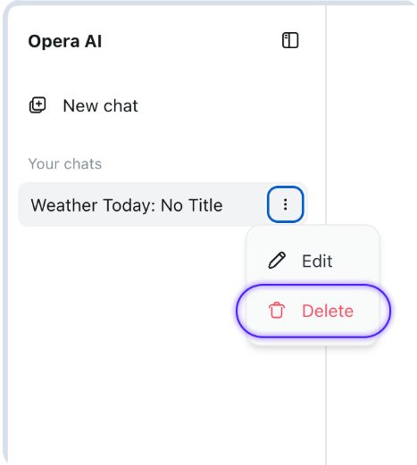 When you’re signed into your Opera Account, your chats are saved for 30 days or until you delete them. When you start a new chat, the previous chat is added to the chat list. To access the chat list: