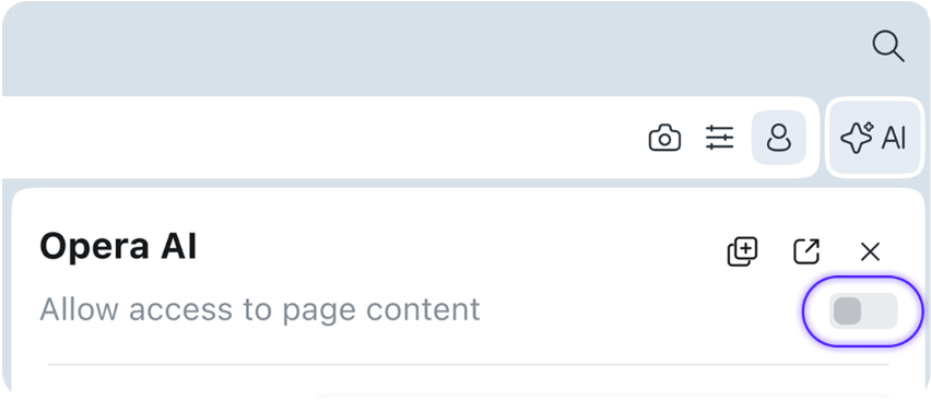 To disable access to page content, toggle off the option at the top of your Opera AI chat. You need to do this prior to beginning a chat.