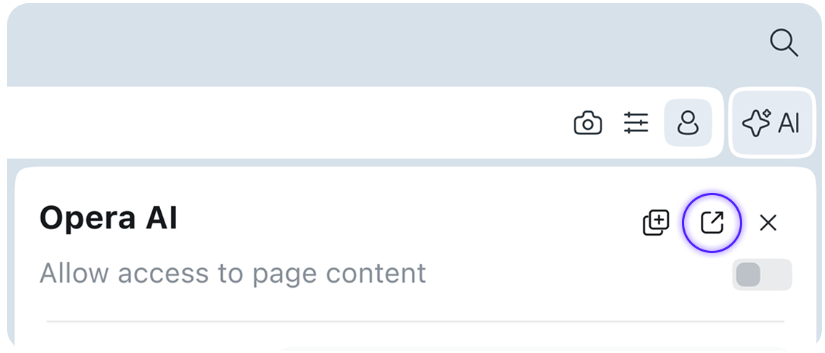 You can expand the Opera AI chat to a full tab in your browser. Full Tab View provides more space for your conversation, access to your list of your chats, as well as access to Settings.