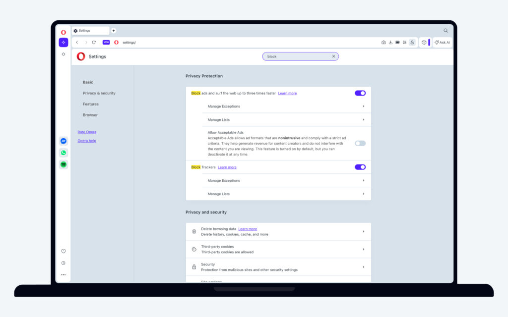 Open Opera’s settings page from the sidebar
